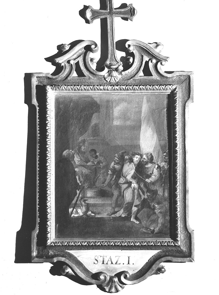 - NOTIZIE STORICO CRITICHE Incollata dietro la tela che raffigura "Cristo davanti a Pilato" si trova una carta dove si dice che la Via Crucis "creduta dei Gandolfi fu sostituita dopo la soppressione di Napoleone alla grande di forma ovale che al presente si trova in San Petronio, dalla navata grande fu traslocata alla piccola nel 1857 circa e ci rimase fino al 15 gennaio 1895 in cui M. R. P. G. B. regalò la nuova in cromografia di Bertarelli di Milano. Le sole immagini e cornici costarono £. 300 trasportate a carico della sacrestia. L'erezione di quest'ultima fu fatta dal R. P. Sanuto guardiano dell'Incoronata alle ore 5 e mezza del giorno e dell'anno suddetto P. B.". Sono quindi indicati come autori i Gandolfi, famiglia di pittori, incisori e stuccatori operanti tra Sette e Ottocento in Emilia, un'attribuzione che credo accettabile se riferita ad un ambito vicino alla personalità di Ubaldo (1728 - 1781), per via del brillante cromatismo tiepolesco che contraddistingue la sua produzione presente anche nei dipinti piacentini in esame, insieme a un tocco rapido e nervoso. La cornice invece appare il prodotto del secondo Ottocento grazie all'assemblarsi di motivi barocchetti (riccioli architettonici), ma appiattiti ad altri neoclassici (la cornicetta a fogliette d'acqua). Per Ubaldo Gandolfi cfr. Roli, "Pittura Bolognese 1650-1800: dai Cignani ai Gandolfi", Bologna 1977, p. 127)