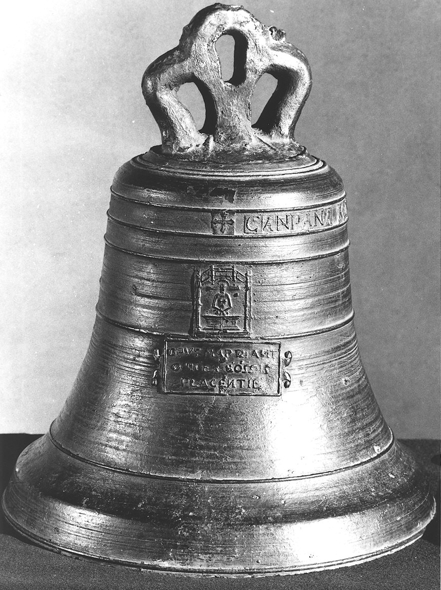 - NOTIZIE STORICO CRITICHE Interessante esempio di artigianato locale del XVII secolo, la campana del Monte di Pietà di Piacenza forse veniva utilizzata per richiamare la cittadinanza in occasione di vendita all'incanto effettuata dal Monte dei Pegni. Se la data di esecuzione è accettata al 1616, va notata la discrepanza nell'iscrizione sulla campana stessa (MDCVXI): è ipotizzabile, a questo punto, un errore di scrittura da parte del fabbro. Così di non facile lettura risulta la scritta nel cartiglio, ma basta a dedurne il nome dell'artefice che risulta effettivamente appartenere a una nota famiglia di fonditori piacentini ("Arte e Pietà. I patrimoni culturali delle Opere pie nella provincia di Piacenza", 1981, p. 99, n. 116). Numero d'inventario: 3496