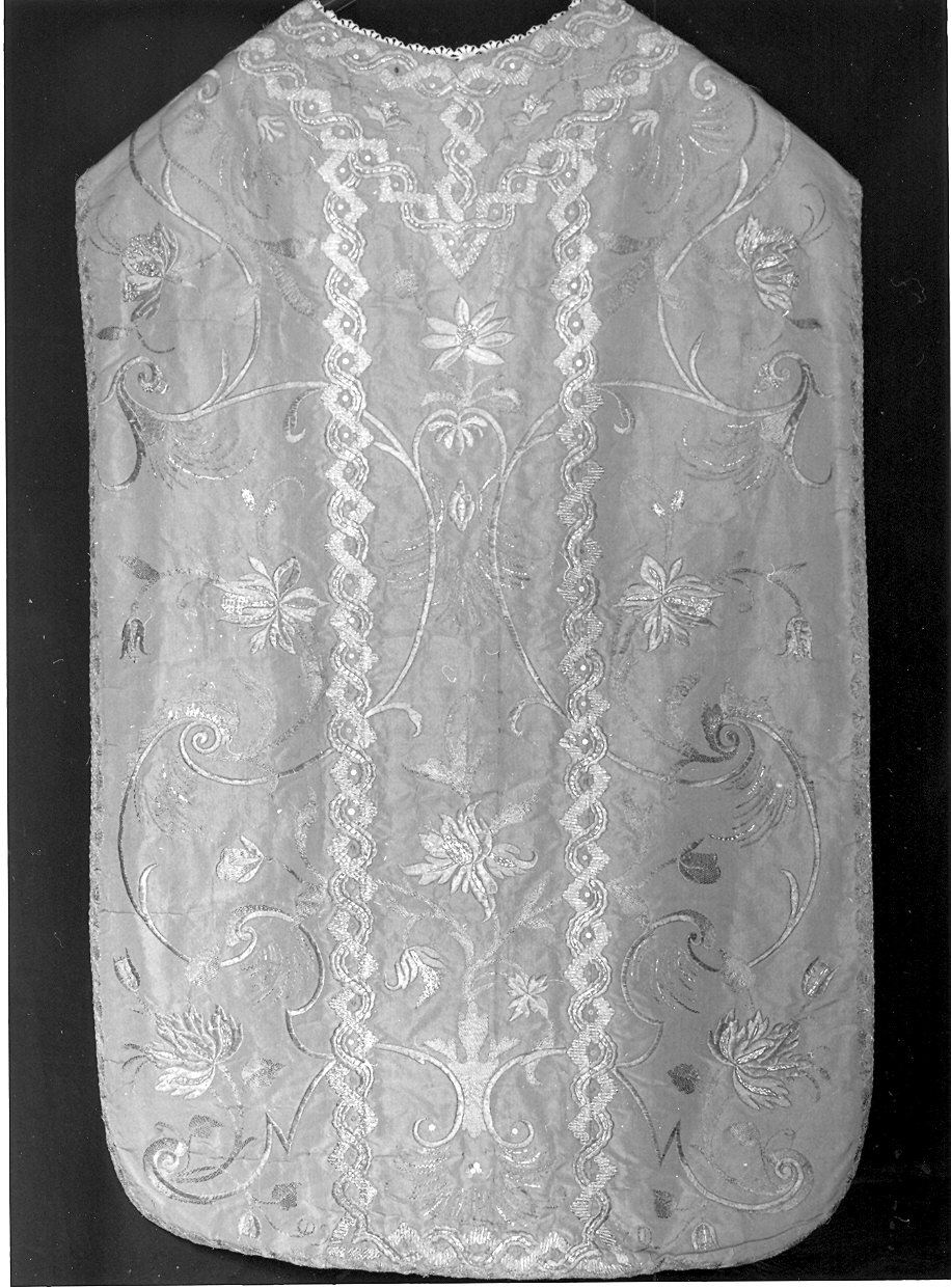 Il parato si compone di una pianeta e di una stola. Raso di fondo prodotto da ordito e trama di seta rosa; ricamo in argento filato e argento riccio completato con applicazioni di paillettes. Il disegno è definito da esili tralci che si sviluppano specularmente dal basso verso l'alto con andamento a voluyte contrapposte dalle quali si dipartono fiori. Il parato è rifinito da un gallone ricamato a nastri intrecciati e da un galloncino a fuselli in argento filato. Fodera in tela rosa