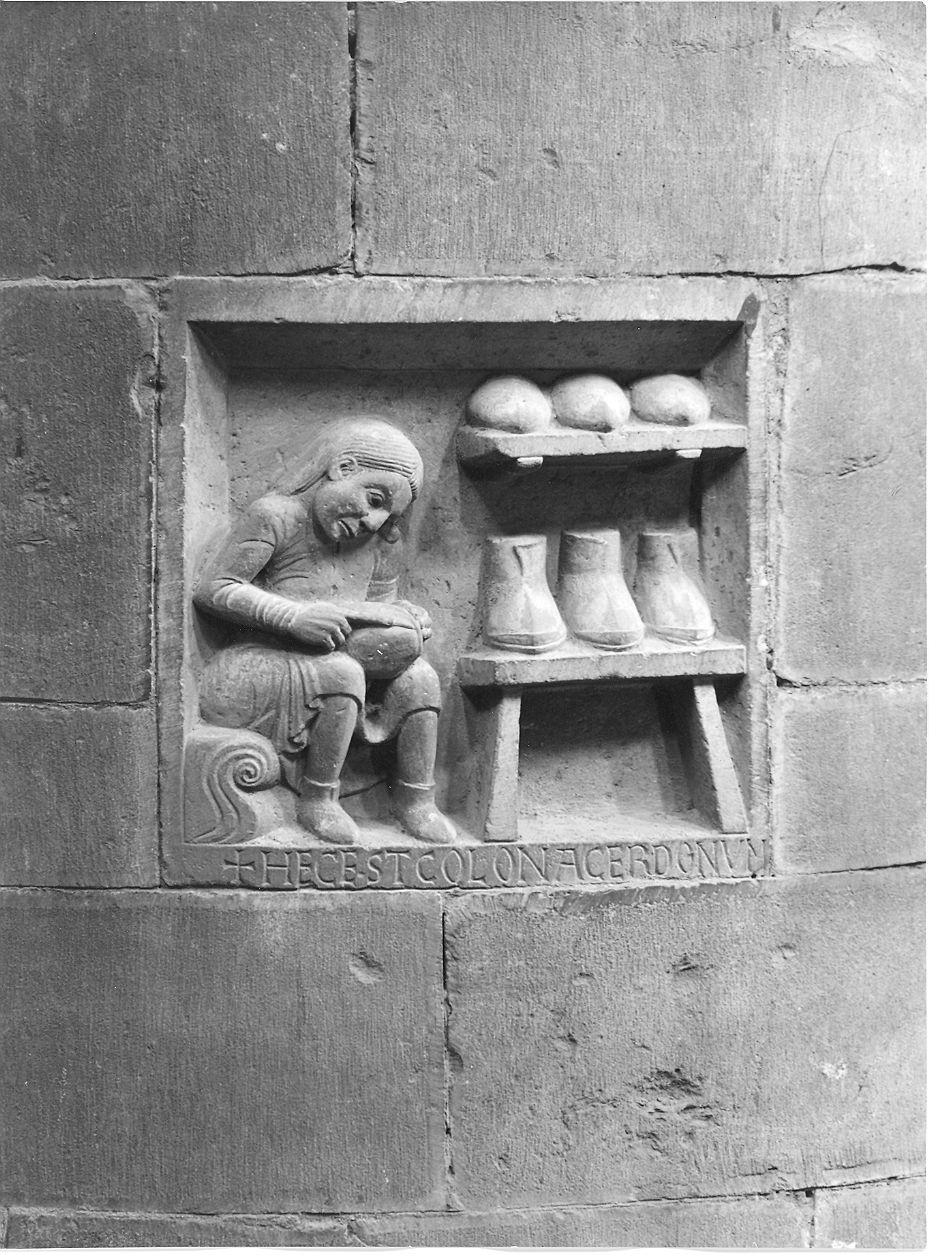 Entro la formella, la bottega è presentata con incisiva semplicità, lo spazio è per due terzi riservato alle scarpe disposte in ordine sul panchetto squadrato e sul piano sovrastante. Nello spazio rimanente è collocato il ciabattino, seduto su un panchetto, col capo reclinato sulla spalla, teso nello sforzo di bucare il duro cuoio. Indossa una corta tunichetta aderente nella parte superiore, mosso da pieghe in quella inferiore. Anche le maniche presentano delle pieghe, ma più rigide