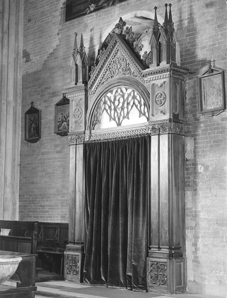 L'apertura è ad arco a tutto sesto decorato con esili motivi goticheggianti che delineano due trilobature, al di sotto l'arco è chiuso da un listello che reca un ornato a tondi riempiti da girali vegetali. La cimasa, cuspidata ed affiancata da pinnacoli a fascio si innesta su elementi a pilastro ornati da capitelli a intreccio vegetale e retti da plinti che recano nella faccia anteriore un decoro mistilineo ospitanti una croce