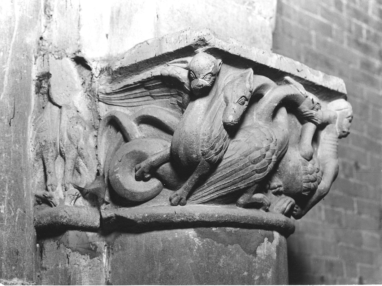 - NOTIZIE STORICO CRITICHE Questo capitello sembra appartenere per la sua semplificazione formale alla terza fase costruttiva del duomo giacchè insiste nella zona di terminazione degli absidi laterali del transetto risalente secondo la Romanini al 1202-1235. Seppure sul finire dell'800 siano stati numerosi, e spesso consistenti, i lavori di restauro compiuti nel duomo tanto da fare affermare al Porter "è ora straordinariamente difficile dire con certezza quali capitelli della cattedrale siano originali e quali restaurati; se questi siano riproduzione di originali antichi o pure voli della fantasia di un architetto contemporaneo" questo pezzo è sembrato far parte al Klein del nucleo originario