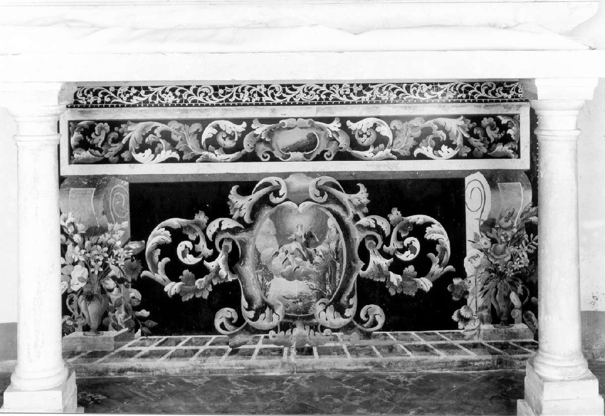 Bordi laterali e superiori decorati in bianco su fondo nero con un motivo a racemi. Sotto il bordo superiore, larga fascia policroma con motivo fogliato. Ai lati, due vasi di fiori posti davanti a due finte mensole a voluta. Campo centrale a fondo nero con ampio ovale con la Madonna Assunta. L'ovale è bordato da una ricca decorazione a foglie