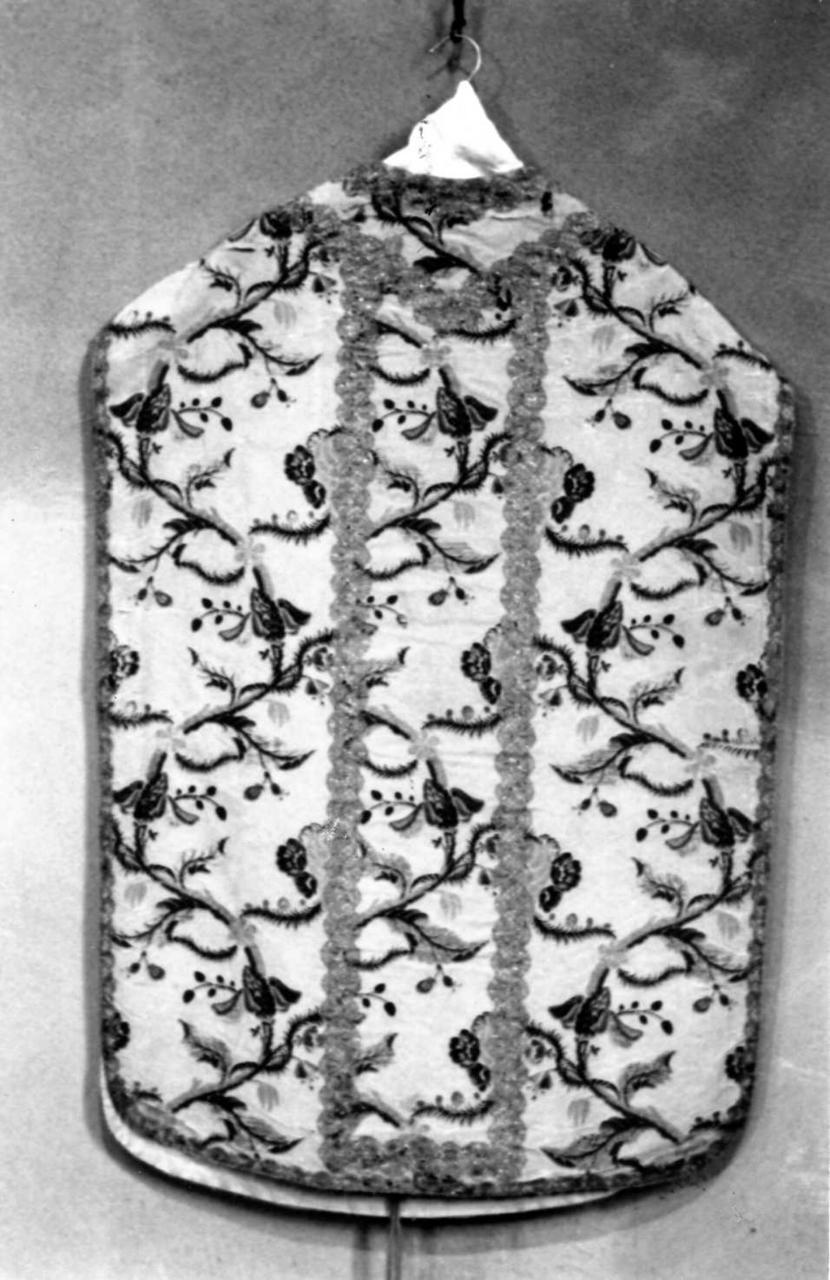 Paramento liturgico composto da una pianeta, una stola, un manipolo, una borsa di corporale e un velo di calice in seta broccata con fondo bianco e disegno formato da fiori di vari colori ed elementi dorati. Gallone in filo dorato; fodera in tela bianca