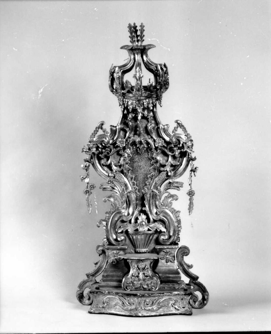 Tronetto con complessa struttura lignea per esporre l'ostensorio: zoccolo e base sagomati e intagliati da racemi e fiorami definiti lateralmente da doppie volute. Il postergale è a larghe volute arricchite da festoni di fiori, elementi fitomorfi, spighe, tralci con grappoli d'uva; in alto un baldacchino a corona ornato di foglie anche nella terminazione