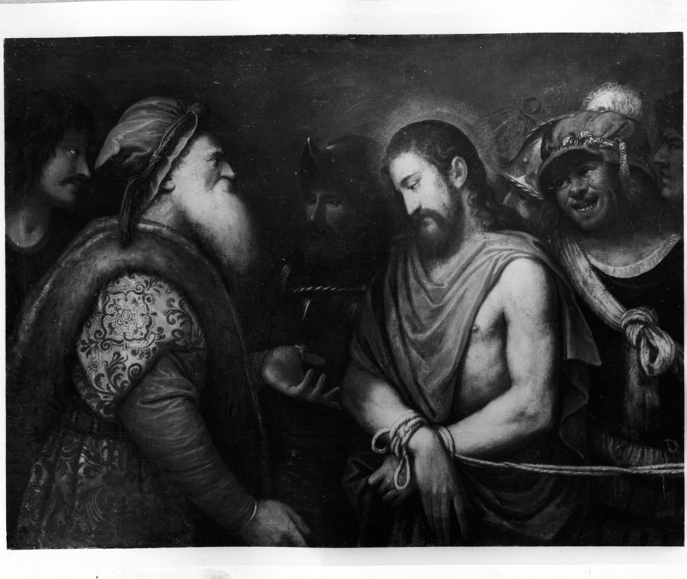 - NOTIZIE STORICO CRITICHE Il dipinto entrò nelle collezioni ducali nel 1805, con il legato Obizzi. Da Castellani Tarabini alla Zocca fu attribuito a scuola veneta del XVI secolo, mentre Von Hadeln lo assegnò a Damiano Mazza. Pallucchini lo riferì invece al veneziano Niccolò Frangipane, motivando tale giudizio con il confronto con il Cristo e la Veronica della Galleria Doria, opera firmata dal 1597. A proposito del dipinto in esame Meijer notava che lìimpostazione delle figure principali è ancora una volta derivata da "Cristo che porta la croce" del Museo Civico di Udine, opera firmata e datata 1572, in cui compare il personaggio che ride, tipico della sua produzione comica e grottesca, e simile a quello che si vede all'estreme destra nella tela con Cristo davanti a Pilato. Così lo definì Marco Boschini: "Pittore curioso fu anco il Frangipane e fantastico humore anch'egli, poiché il capriccio del suo operare si dilatava in formare cose facete e ridicole..."