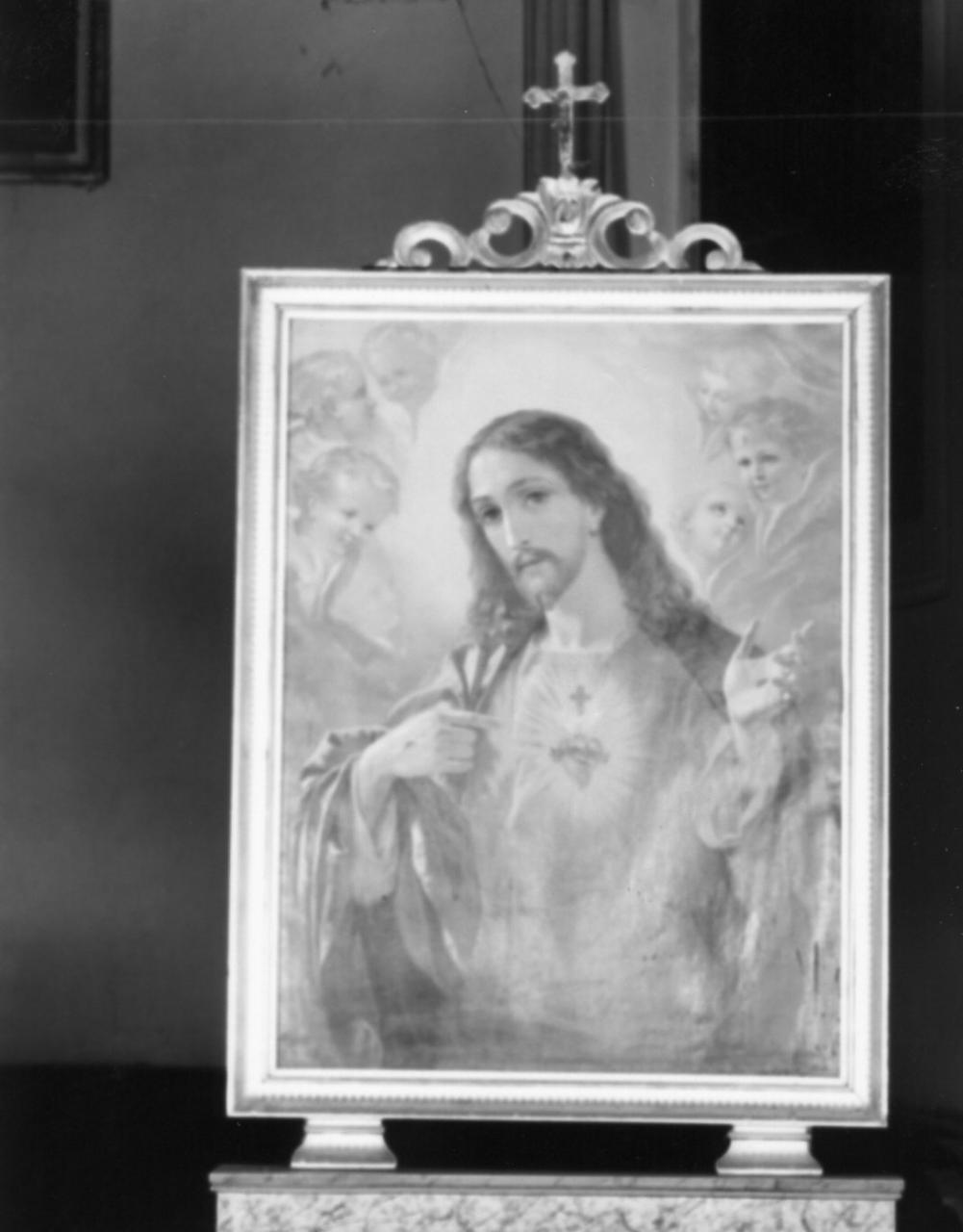 Crocetta apicale con Cristo in metallo. All'interno due oleografie rappresentanti il Sacro Cuore di Gesù e il Sacro Cuore di Maria