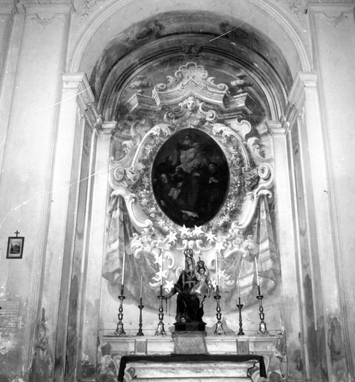 Il motivo architettonico della parete di fondo imita una esedra a praste su toni a monocromo grigio verdino, il timpano è spezzato, con vasi ornamentali. Al centro è una grande finta cornice ovale a vute arricciate e spezzate, ghirlanda di fiori policrmi intorno la tela ovale e drappeggio sostenuto in nodi sui lati come stoffa a larghe bande bianche, gialle, rosse, frangiata di giallo. Riquadratura sui lati e nella volta