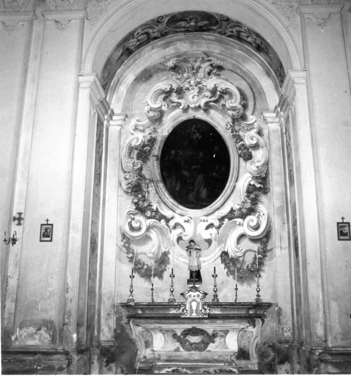 La parete ha riquadri esmplari tondeggianti in monocromo giallo rosato. Intorno al dipinto ovale campeggia una grande finta cornice in monocromo osato, forte chiaroscuro, disegno di volute spezzate a cartoccio, decorate da festoni di foglie e fiori policromi. Sui lati delle pareti riquadri in volute e nella volta tra ornati ua medaglia con la bianca colomba dello Spirito Santo