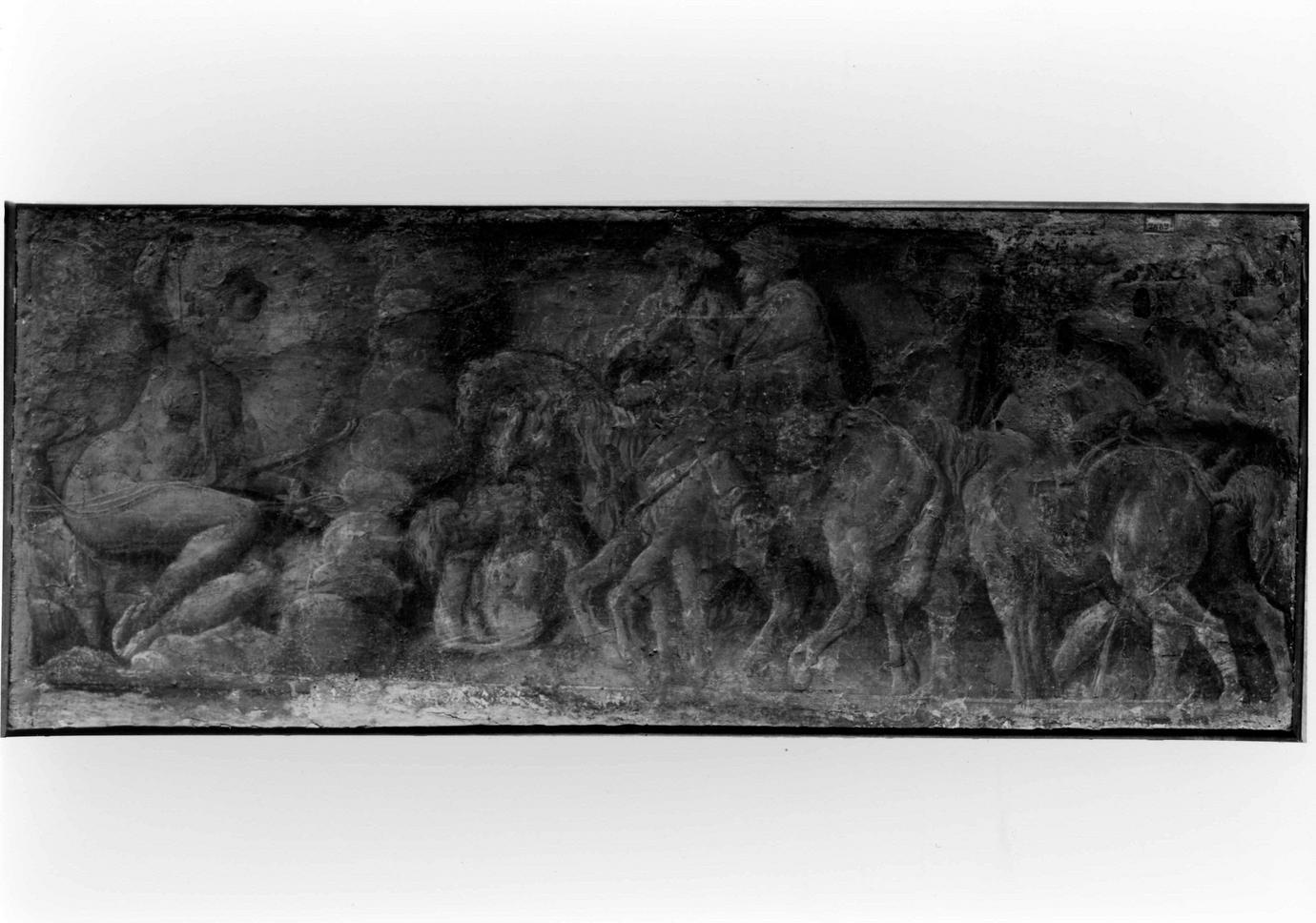 - NOTIZIE STORICO CRITICHE L'affresco monocromo ocra, insieme a quello raffigurante "Costellazioni e Divinità", faceva parte della decorazione di un ambiente della Rocca di Novellara. Legati ai due monocromi violetti con scene tratte dalle Metamorfosi di Ovidio per datazione e unità di progetto (cfr. SBAS MO 08/00283051, inv. 8098), i due affreschi color ocra nascondono un significato ermetico ancora da individuare. Datati ai primi anni Quaranta del '500 da Salvini (1950) per l'influenza parmigianinesca individuata soprattutto nella figura di Diana, sono stati giudicati coevi alla decorazione del "Camerino di Ganimede" da N. Clerici Bagozzi (1988). L'affresco staccato è oggi su supporto in vetroresina