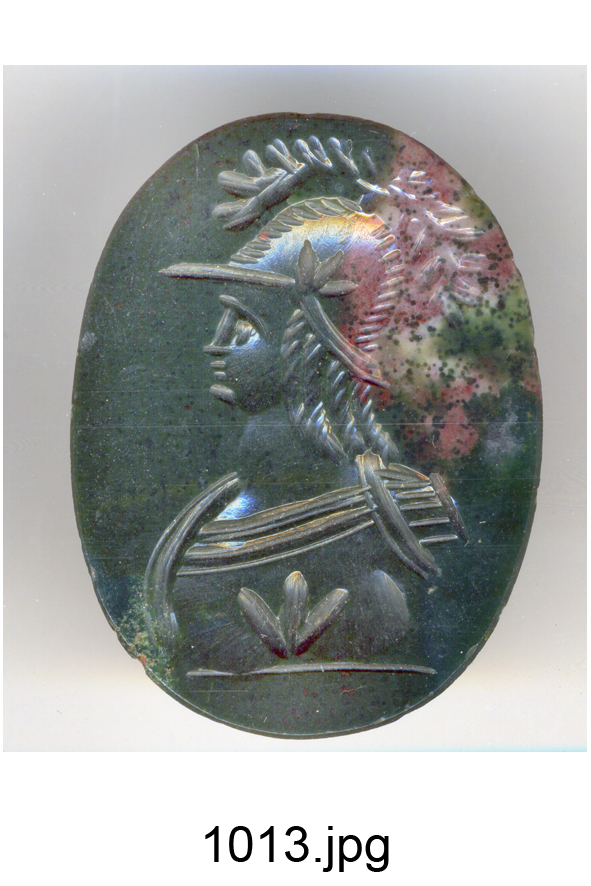 Forma ellittica; Zwierlein-Diehl 8. Ampia porzione di busto di persogaggio maschile in armatura, rivolto verso s., con elmo crestato, lunga capigliatura a boccoli che arriva quasi alle spalle, armatura e mantello drappeggiato attorno al collo