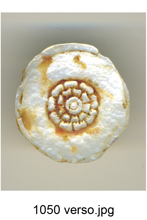 Forma subcircolare con entrambe le facce decorate. Sulla faccia principale troviamo la raffigurazione di una testa maschile laureata a d. dai tratti somatici fortemente caratterizzati: collo taurino, alta fronte e naso imponente. Sull'altra faccia è stato inciso un fiore stilizzato con duplice corolla