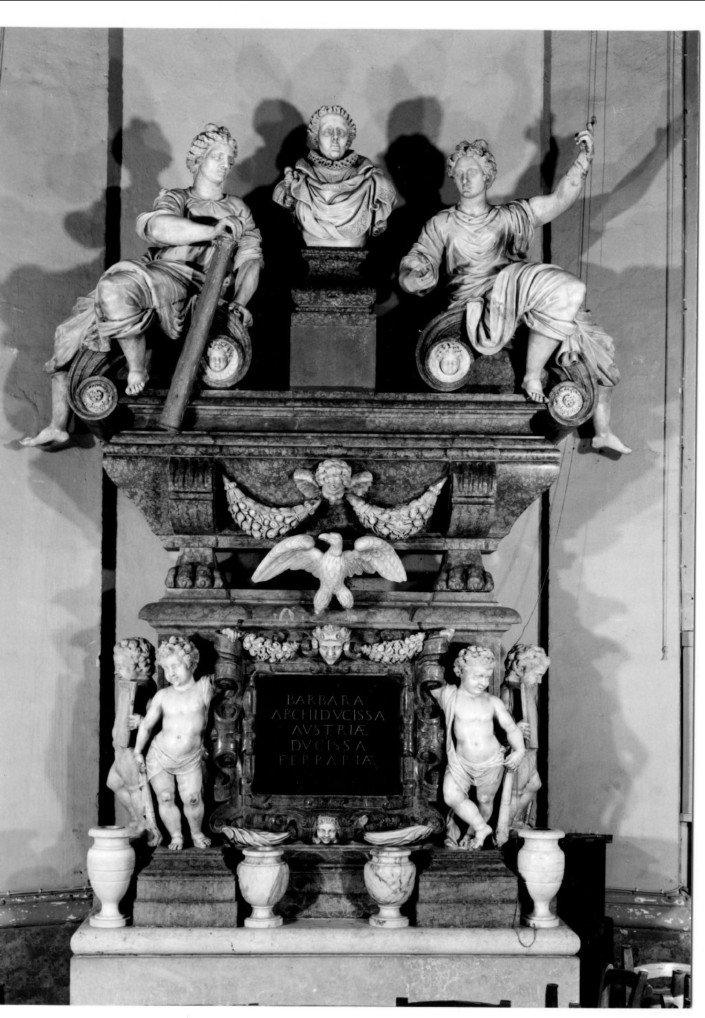 - NOTIZIE STORICO CRITICHE Il monumento fu voluto da Alfonso II d'Este per onorare la memoria della seconda moglie Barbara d'Austria e, nello stesso tempo, per la pressante necessità politica di mantenere buoni rapporti con l'Imperatore-cognato Massimiliano II. Barbara d'Austria-Este morì di tubercolosi nel 1572, sette anni dopo il matrimonio con il duca Alfonso, ma i lavori per il monumento funebre iniziarono solo nel 1584 con un primo incarico ad uno scultore, tal "Vincenzo da Bologna", che, però, non iniziò mai il lavoro. L'attenta disamina delle fonti archivistiche modenesi, ha portato Manni (1986) a ricostruire le fasi salienti dell'impresa e a capire i meccanismi di un'organizzazione basata sulla distribuzione di una piccola quantità di lavoro a varie botteghe artigiane : un équipe composita coordinata dallo scultore Orazio Grillenzoni (carpigiano ma molto attivo presso la corte ferrarese) che, secondo i documenti trovati da Manni, si avvalse anche della collaborazione di Bastarolo per l'ideazione dell'insieme. Nel 1592 le parti vennero assemblate nella forma attuale