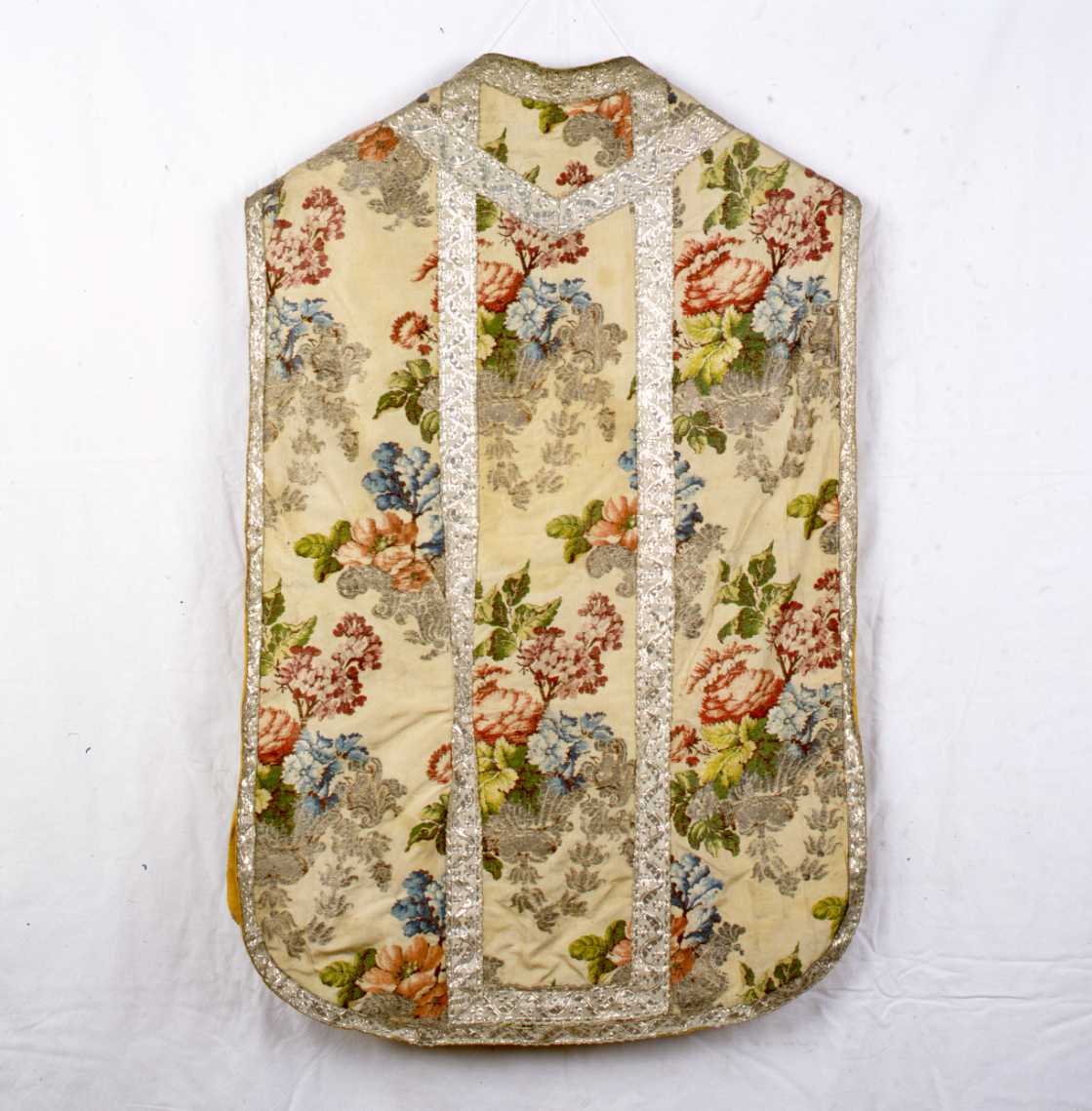 Paramento liturgico composto di una pianeta, una stola, un manipolo e una borsa in seta fondo bianco con ricche composizioni di fiori in vasi argentei. Fiori azzurri, viola, bordò e arancio. Gallone argento