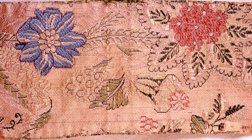Paramento composto da: pianeta e stola. Fondo in raso beige scuro con fiori rosa, azzurri e verdi distribuiti su un motivo ondulante color perla. Federa in canapa e gallone in seta gialla e oro