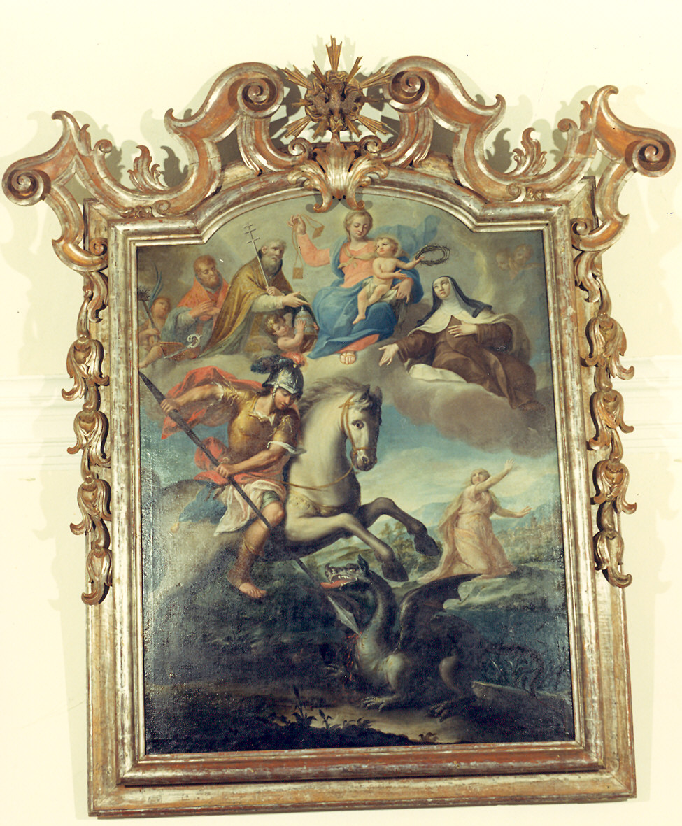 - NOTIZIE STORICO CRITICHE L'opera che presenta caratteri tipici della pittura parmense settecentesca, per la grazia un pò bambolesca delle figure e per i colori brillanti, viene restituita con sicurezza da Godi e Cirillo a Paolo Ferrari che fra il 1746 e il 1784 lavorò agli "altari maggiori parrocchiali sia al di là del Taro, ma non più in su di Varsi, sia al di qua, ma di minor entità nella pianura presso Parma". Di lui il Bertolazzi afferma "fu pittore di assai mediocre abilità ma di lena infaticabile talchè non v'ha chiesa, per modo di dire, tanto in città che in campagna, che non abbia o a olio o a fresco qualche tela o muro imbrattate dai suoi pennelli". In effetti si possono cogliere più punti di contatto con altre opere attribuite a Paolo Ferrari presenti sul territorio parmense, ad esempio con la "Madonna col Bambino e i santi Francesco d'Assisi, Margherita da Cortona e Vincenzo Ferreri" della chiesa di San Moderanno a Berceto, o il "San Filippo Neri ha la visione della Madonna con il Bambino" dell'Oratorio di San Luigi a San Secondo Parmense in cui in particolare i gruppi con la "Madonna col Bambino" sono assai simili a quello presente nel quadro in esame, o con il "San Martino e il povero" della chiesa di San Martino a Palanzano in cui il San Martino richiama da vicino il San Giorgio del nostro dipinto