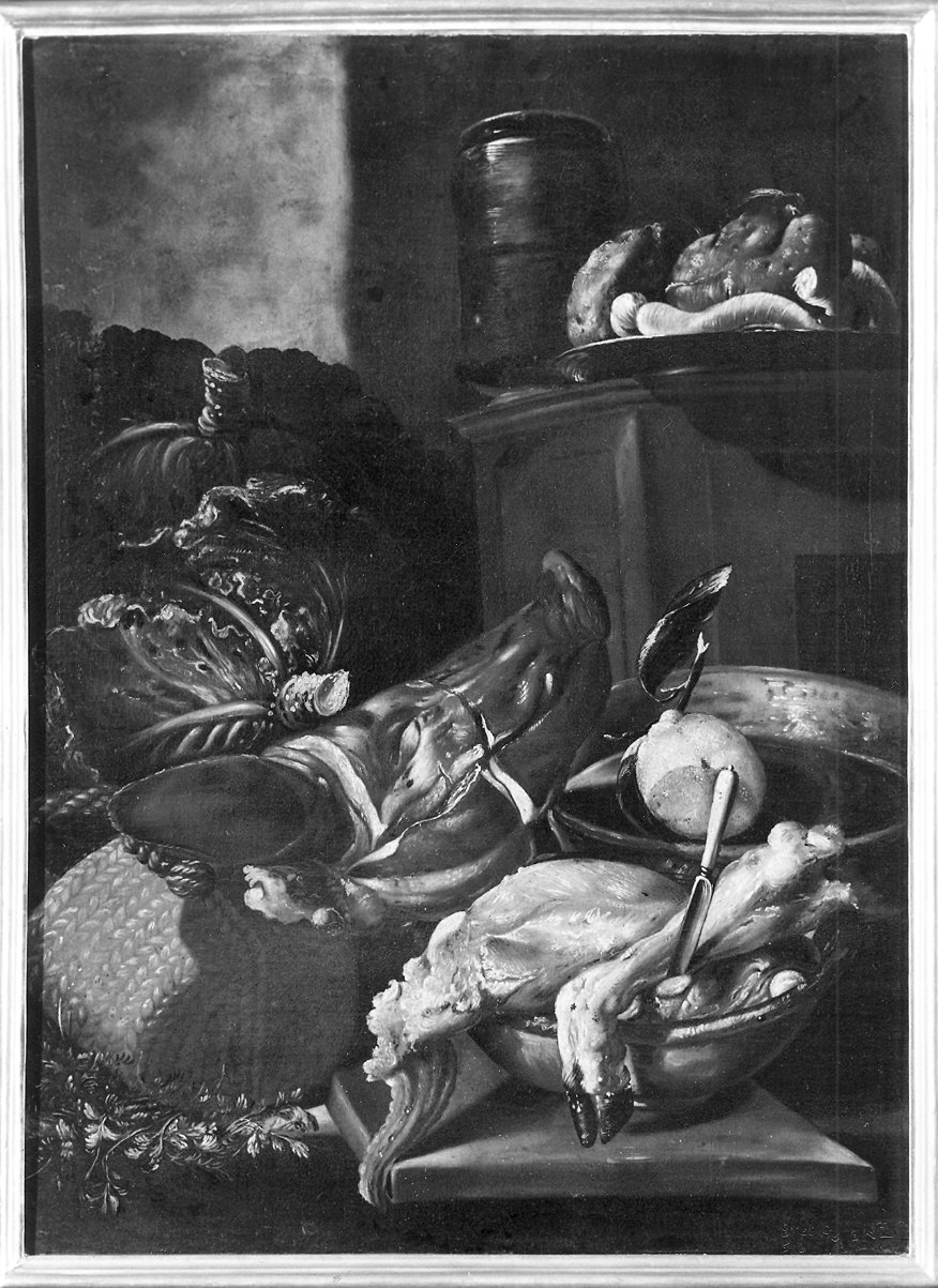 - NOTIZIE STORICO CRITICHE Insieme alla "Natura morta con grugno di maiale" proviene dalla collezione piacentina del cardinale Alberoni: sono descritte nell'inventario in maniera alquanto generica (Rossi, III, 1978, p. 297, n. 73). Furono segnalate per la prima volta nel catalogo della galleria Alberoni dal Pancotti che le attribuì al piacentino Felice Boselli (Pancotti, 1932, p. 11). Tale attribuzione fu confermata dall'Arisi che le ritene opere giovanili dell'artista (Arisi, 1973, p. 214). Rossi assegnò invece le opere a Giacomo Ceruti ritenendole una committenza diretta dell'Alberoni all'artista (Rossi, III, 1978, p. 343). Più recenti studi documentari hanno portato ad individuare la personalità di un artista locale specializzato nella natura morta, tale Bartolomeo Arbotori al quale sono riferibili le due pitture alberoniane. Lo provano le analogie riscontrabili con due pitture autografe dell'artista, ora nella Galleria Nazionale di Parma, come segnalato da Arisi (cfr. Arisi - Mezzadri, 1990, p. 328)
