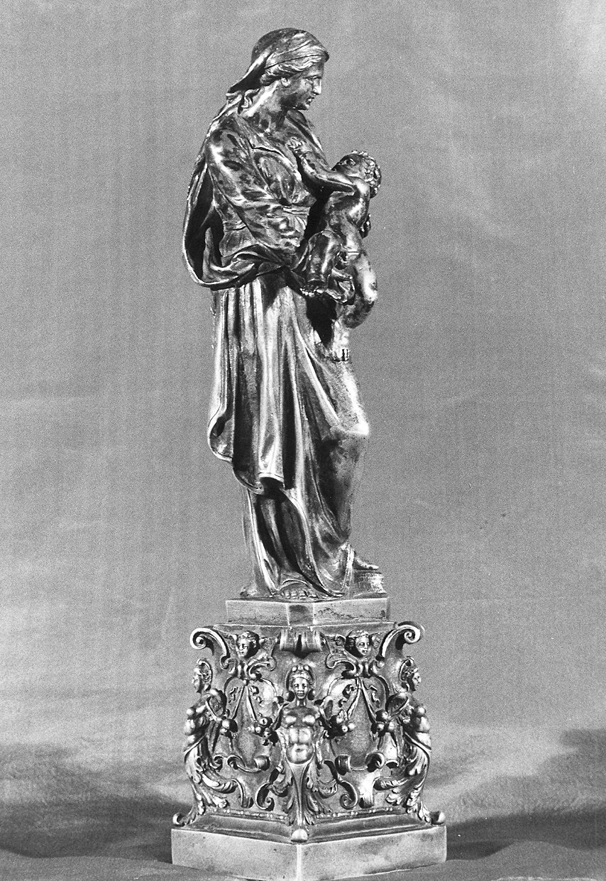 La Madonna stringe tra le braccia il Bambino in atto di succhiare il latte; il capo è coperto dal velo mentre la veste ed il mantello ricadono in morbide pieghe sulla sinistra. Il piedistallo, quadrangolare, presenta un raffinato motivo decorativo: agli angoli stanno sfingi dalle quali si dipartono encarpi raccolti al centro sotto la testa dell'angioletto le cui ali si inseriscono nelle volute degli spigoli