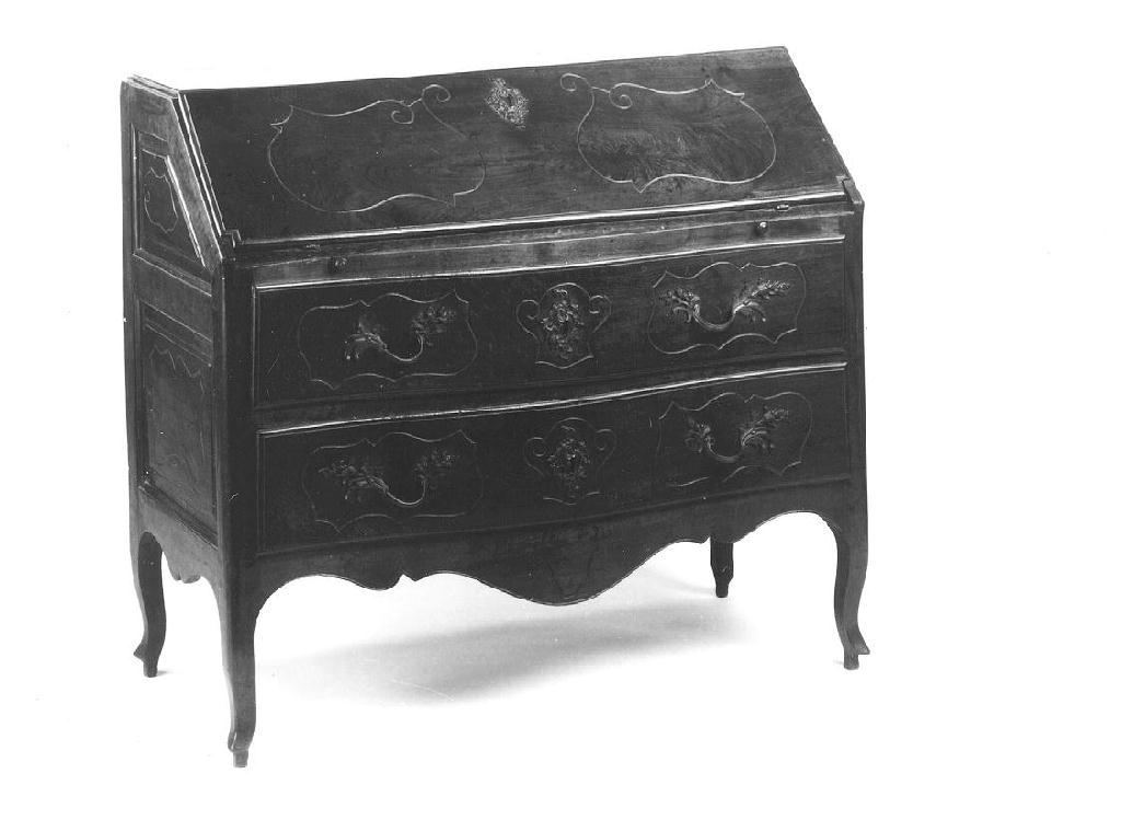 Piedi a capriolo, su cui poggia una cimasa a volute e due cassetti sagomati con maniglie e serrature originali in bronzo. La ribalta apribile, con sostegni estraibili a barra rettangolare, scopre due cassettini per lato separati al centro da una nicchia