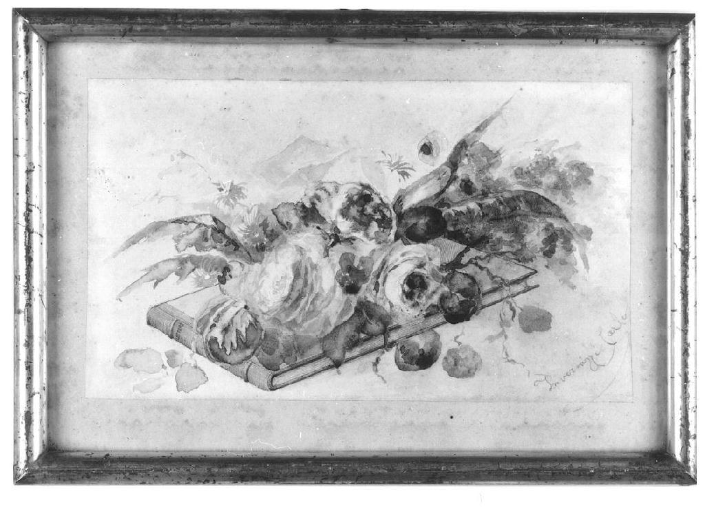 - NOTIZIE STORICO CRITICHE L'acquerello rappresenta un libro posto trasversalmente sul foglio (sulla costa si legge "Lettera") su cui poggia un disordinato mazzo di rose e altri fiori. Predominano i colori vivaci: verde, azzurro, rosa e rosso. Opera assai modesta di autore del tardo Ottocento, presumibilmente di formazione lombarda