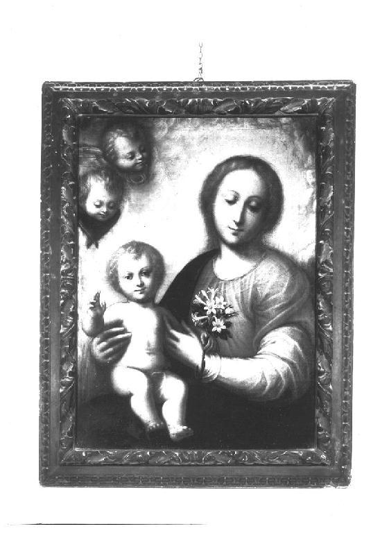 Il dipinto rappresenta la Vergine a tre quarti di figura, in abito rosa e manto azzurro nell'atto di sorreggere il Bambino che con la mano destra benedice e con la sinistra tiene un ramo di gigli. In alto a sinistra è una coppia di cherubini mentre nubi dorate fanno cornice al capo della Madonna