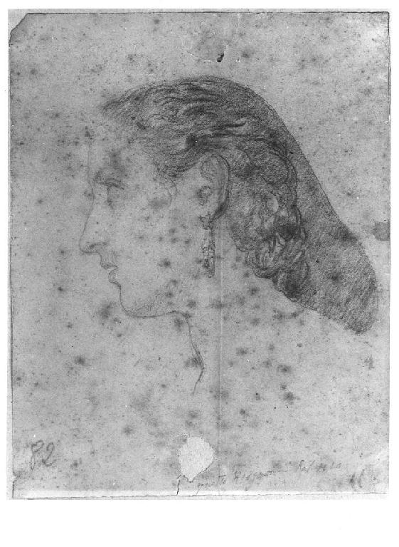 - NOTIZIE STORICO CRITICHE Ritratto femminile appena abbozzato "dal vero" (cfr. postilla autografa), genere nel quale l'autore rivela una qualità tecnica ed espressiva maggiore di quella raggiunta nei soggetti storici o sacri. Caratteri che lo avvicinano ai ritrattisti del "verismo lombardo" tipico del secondo Ottocento; opere da situare quindi negli anni successivi al soggiorno milanese, che evidentemente lo porta a conoscere da vicino quel tipo di ambiente