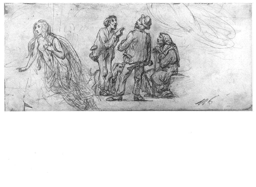 Studio che raffigura sulla sinistra una donna ignuda in volo, mentre al centro figura un grupo di poveretti a colloquio fra loro: uno con un cane parla ad un altro, mentre una vecchina seduta li ascolta. Indossano abiti modesti, ottocenteschi