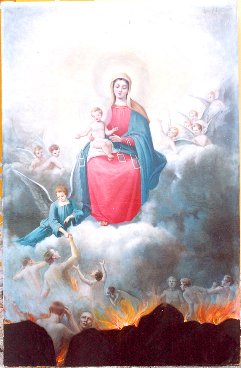 Personaggi: Madonna; Bambino Gesù. Figure: angeli; anime purganti. Fenomeni metereologici. Fenomeni naturali