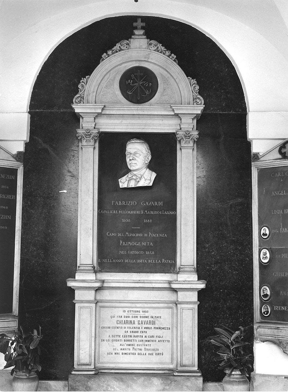 - NOTIZIE STORICO CRITICHE Questo monumento sepolcrale che ricorda il sindaco e patriota piacentino Fabrizio Gavardi (Mensi - Fioretto) si deve alla prima attività della ditta Monti. La struttura dell'edicola architettonica non sembra discostarsi troppo dalla prassi consueta, allo stesso modo il busto sembra proseguire le impronte del realismo ritrattistico imperante che ricerca di suggerire con la scultura la materia stessa del soggetto raffigurato. Il bassorilievo in questione dovrebbe essere riferito alla mano dello scultore Annibale Monti, così come suggerisce anche l'Arisi