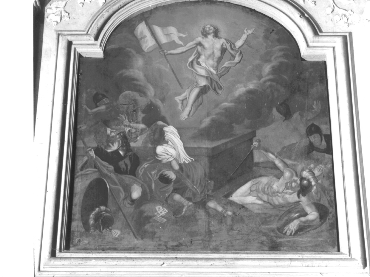 La tela, superiormente centinata, raffigura Gesù risorto tra lo stupore dei soldati. Cristo, vestito solo di un drappo, reca il vessillo nella mano destra e volge lo sguardo al cielo