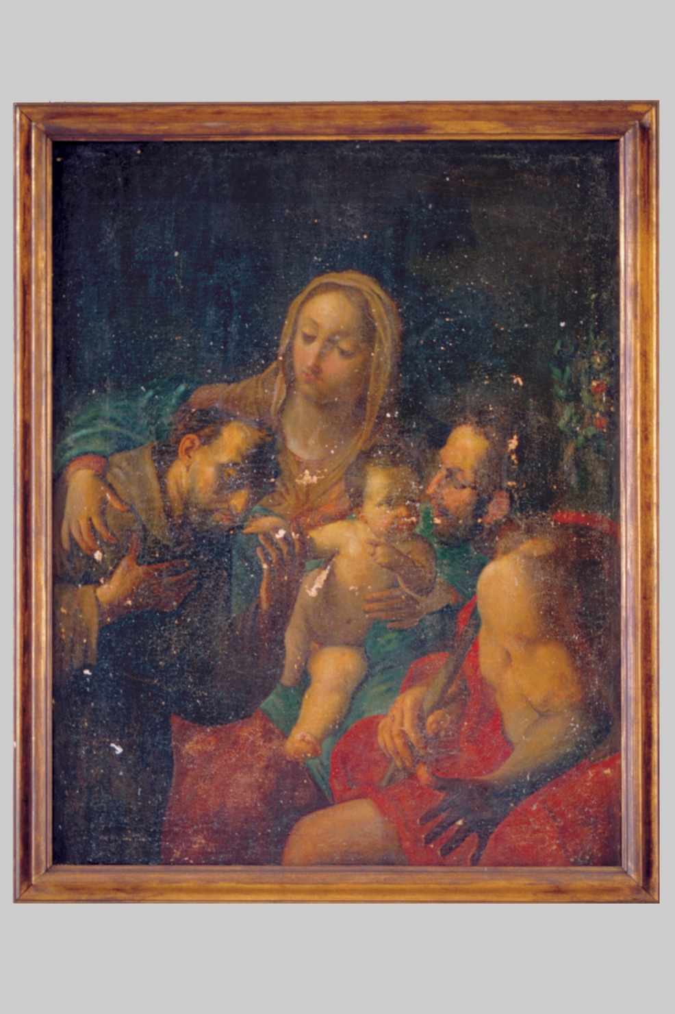 - NOTIZIE STORICO CRITICHE Il dipinto è schedato come Franceschini nell'Inventario del 1988, con una datazione generica al secolo XVII, mentre Santangelo lo considera di autore parmense influenzato dal Ferrari e propone una datazione al XVIII secolo. Raffronti con lavori del Franceschini quali la "Madonna col Bambino e i Santi Celestino, Luca e Giovanni Battista" della chiesa bolognese dei Celestini sostengono l'attribuzione ad un pittore prossimo ai suoi modi. Il cattivo stato di conservazione e alcune parti piuttosto deboli come l'abbraccio della Madonna non consentono di riferire il lavoro parmense al maestro bolognese. La cromia vivace e il chiaroscuro piuttosto risentito fanno supporre una possibile datazione tra lo scadere del XVII secolo e l'inizio del successivo.Inv.n.115-50