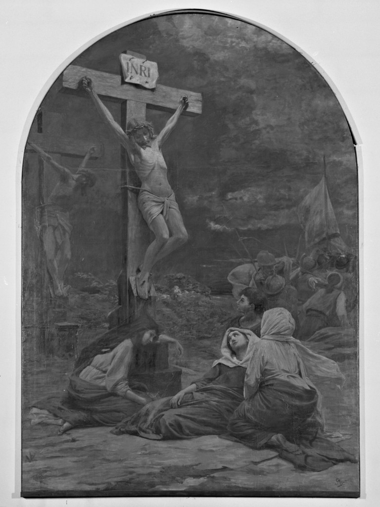 - NOTIZIE STORICO CRITICHE Donato alla chiesa dal Cavalier Angelo Brunetti, zio dell'artista morto nel 1915. Dapprima il dipinto era destinato al sottoportico che conduce a San Luca, dove però sarebbe stato troppo esposto alle variazioni atmosferiche. Scartata l'ipotesi di collocarlo all'interno della basilica, fu infine assegnato alla chiesa della Mascarella, dove arrivò nel 1924. Sistemato inizialmente nella terza cappella sinistra e successivamente trasferito nella terza cappella destra, dove rimase fino all'epoca della distruzione della vecchia chiesa (1944). Lievemente danneggiato dai bombardamenti fu temporaneamente trasferito nell'immediato dopoguerra nella chiesa della B. V. del Soccorso. E' considerata la maggiore opera del pittore Giovanni Masotti