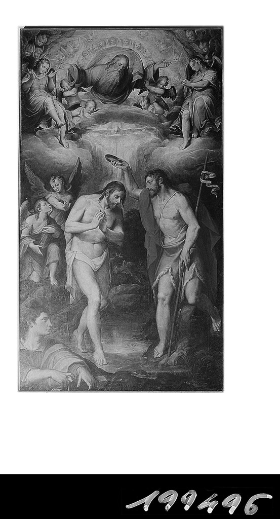 Al centro della scena sono gesù Cristo e il Battista. In primissimo piano a mezzo busto, San Giovanni evangelista e sullo sfondo angeli. In alto Dio Padre circondato da angeli e circonfuso dalla luce