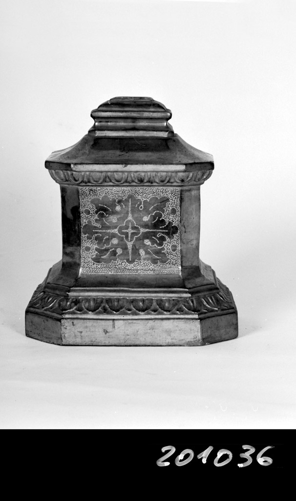 Base a profilo ottagonale decorata da cornice a unghiature che si ripete nella parte superiore. Nella faccia è una decorazione bulinata