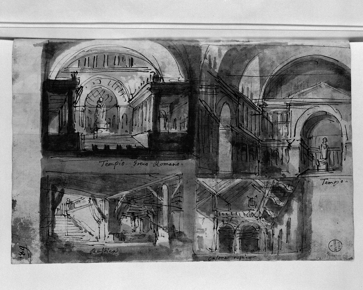 - ISCRIZIONI sotto il disegno - TEMPIO GRECO ROMANO/ TEMPIO/ RUSTICA/ CASONE RUSTICO - A. Basoli - corsivo - a penna -