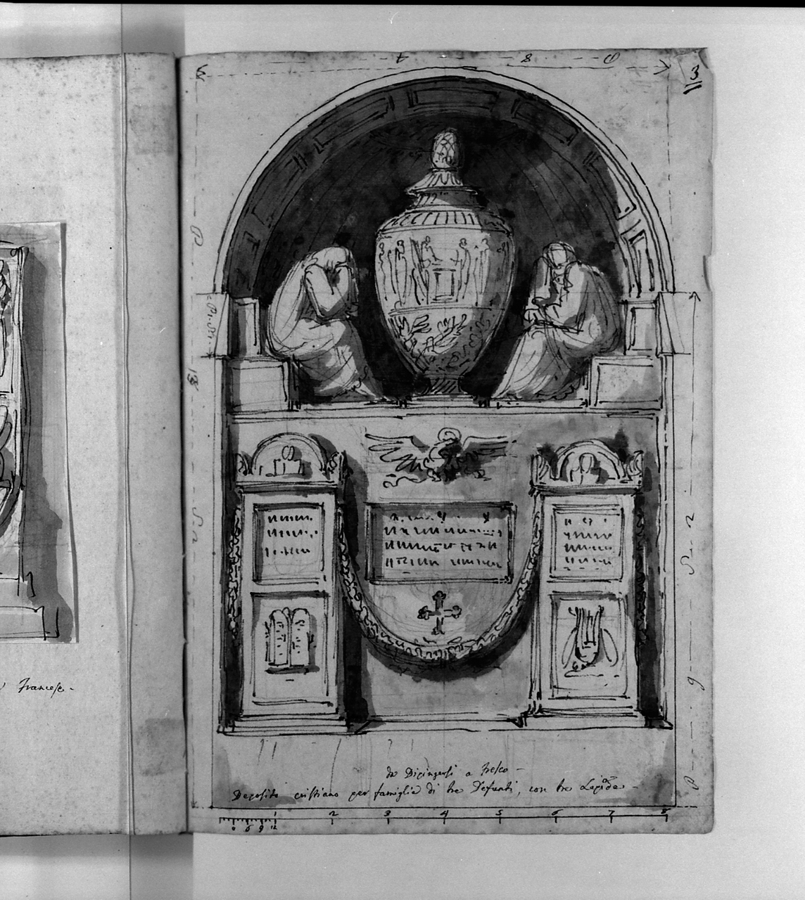 - NOTIZIE STORICO CRITICHE Nell'Indice dei soggetti del taccuino l'acquerello è posto nella serie "Depositi sepolcrali per scultura". Dalla "Vitta artistica" risulta che Basoli si occupò di monumenti sepolcrali nel 1804 (deposito Orsi nella Certosa di Bologna), nel 1805 (deposito di Forlì) e nel 1814 (deposito per famiglia Rusconi nella Certosa di Bologna) (cc. 22, 24, 46)