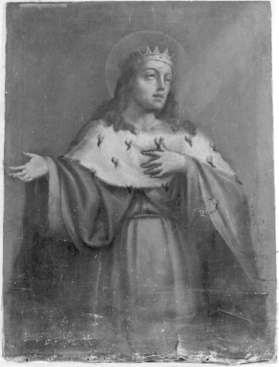 Il santo è raffigurato a tre quarti di figura, in abito monacale con la mantellina d'ermellino sulle spalle; sul capo porta la corona regale e rivolge lo sguardo verso l'alto