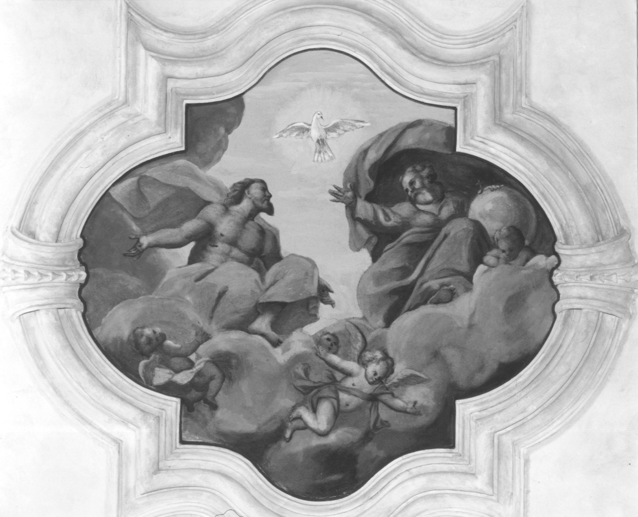 Al centro della medaglia mistilinea in stucco sono raffigurati, in un'aureola di gonfie nubi animate da angioletti, Dio Padre e Cristo; in mezzo a loro si libra, sospesa sullo sfondo limpido e solare, la colomba dello Spirito Santo