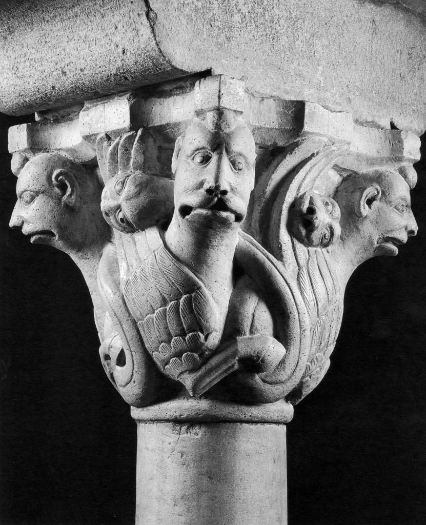 Quattro teste, metà umane e metà animali sporgono dagli spigoli in corrispondenza delle punte aggettanti dell'abaco soprastante. Il collo robusto di questi esseri si allunga e si curva seguendo lo svaso del capitello. Un'ala piumata e una zampa equina costituiscono il resto del corpo, mentre la coda, riavvolta su sè stessa, si svolge in una testa di serpente che va a posarsi sull'ala nella parte mediana di ogni faccia del capitello