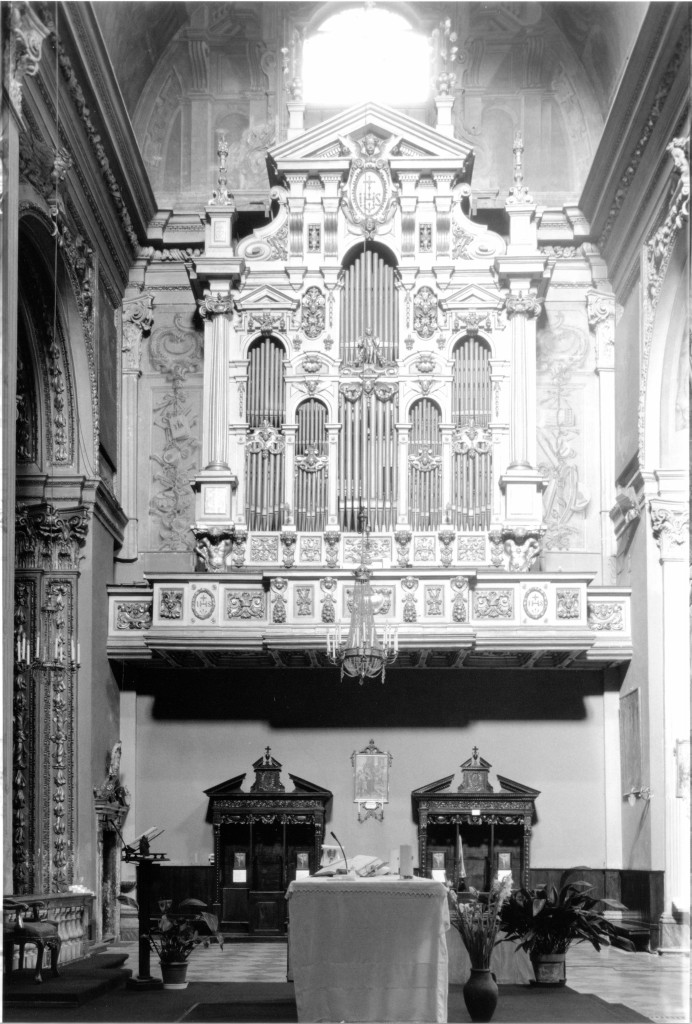 Legno intagliato, dipinto in bianco e dorato. Il fronte delle casse d'organo ha struttura monumentale e architettonica con colonne scanalate corinzie sui lati, aperture sovrapposte centinate, trabeazioni triangolari e centinate con festoni annodati. Il timpano è sostenuto da mensoloni arricciati anche sui lati a volute, ha nel mezzo lo stemma gesuitico e frontone triangolare su cui sono vasi ornamentali e candelabri