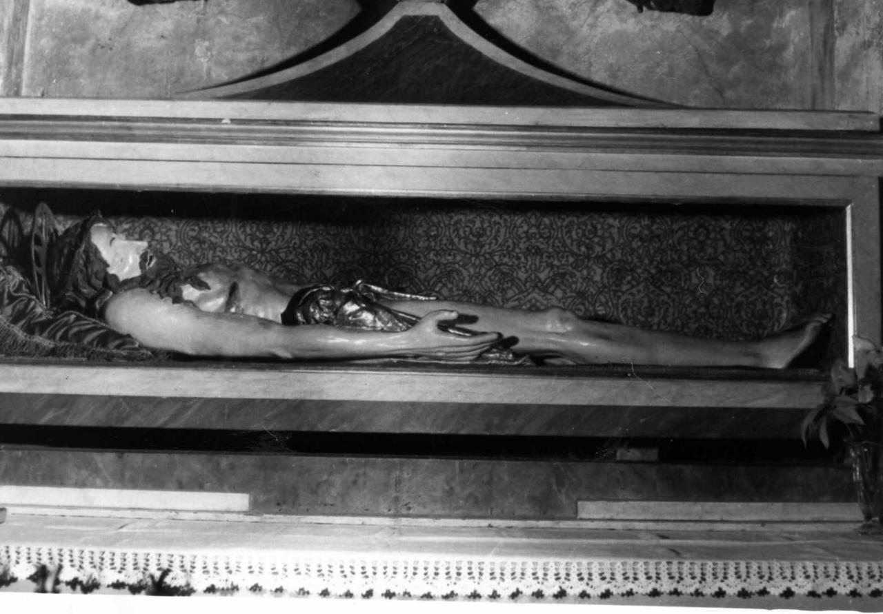 Il Cristo, appoggiato a un cuscino, ha perizoma dorato. E' dentro ad una cassa dilegno verniciato in bianco e oro aperta nel davanti con cristallo