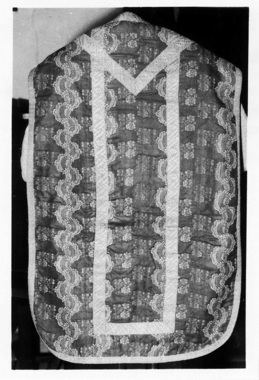 Seta a broccato di color rosso vinaccia. Disegno di strisce a pizzo verticali in bianco a motivo ondulato che si alternano a piccoli fiorellini policromi. Fodera di stoffa rosata e gallone moderno di stoffa gialla operata. Completa degli accessori