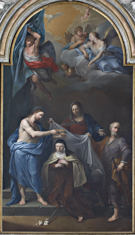 Il dipinto, centinato sul lato superiore, è inserito in cornice lignea dorata