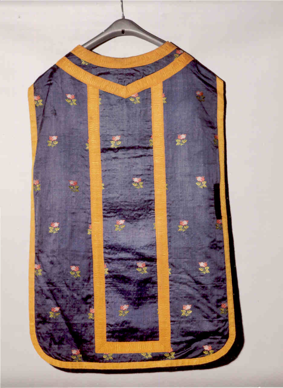 - NOTIZIE STORICO CRITICHE Il tessuto presenta una decorazione floreale stilizzata grazie al largo modulo disegnativo, reso suggestivo dalla presenza dei piccoli mazzetti fioriti (tulipani ?) disposti a maglie larghe su un fondo blu intenso. La particolare soluzioe compositiva -semplice ma elegante- di tipo neoclassico e la policromia ridotta a poche gamme datano la pianeta all'ultimo quarto del Settecento