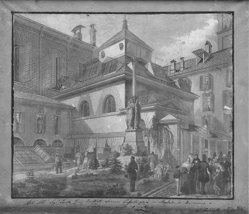 - NOTIZIE STORICO CRITICHE Il piccolo foglio, come ci informa l'iscrizione, è stato offerto dall'architetto Antonio Rinaldi, nato a San Secondo nel 1806, al conte milanese Giovan Battista Luccini Passalacqua e raffigura il cortile di un elegante palazzo a più corpi recante al centro un monumento a struttura piramidale con alta cuspide sostenuta da quattro cariatidi femminili su robusto basamento. Alcune persone elegantemente abbigliate nei costumi del'epoca conversano fra di loro e sembrano ammirare il monumento; un giardiniere è accanto alla serra intento al suo lavoro. Non è da escludere che il puntuale disegno, condotto a penna e all'acquerello con indubbia perizia tecnica, sia proprio una veduta parziale del palazzo Passalacqua a Milano già terminato nel 1842 su progetto dell'architetto Gioacchino Crivelli di cui il Rinaldi è stato il più stretto e fidato collaboratore, tanto che "assente quel suo maestro, nel tempo della fabbrica, la diresse e la compì" (cfr. Lasagni 1999, vol. IV, p. 106 che pubblica anche le recensioni comparse sui periodici del tempo). Sempre per il conte Passalacqua, a riprova dei rapporti consolidati e della stima acquisita, realizza pochi anni dopo il monumento funebre. Il Rinaldi, pur esercitando gran parte della sua attività a Milano, mantiene costanti rapporti con Parma donando tra l'altro all'Accademia di Belle Arti, presso cui aveva frequentato con profitto il corso di architettura, un cospicuo numero di suoi lavori fra disegni, stampe e gessi (cfr. Atti...1846-1852, seduta del 5 febbraio 1850, c. 184)