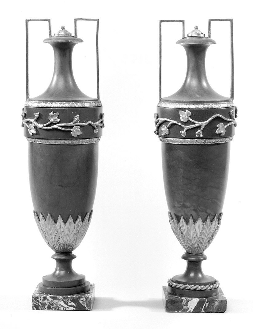 Su una base in marmo grigio screziato poggia un'anfora in porfido rosso costituita da un piede ornato da un cordone in bronzo dorato, corpo ornato in basso da una serie di foglie di palma e sulla fascia superiore un racemo di vite con pampini in bronzo dorato, sul collo si impostano due anse in bronzo dorato