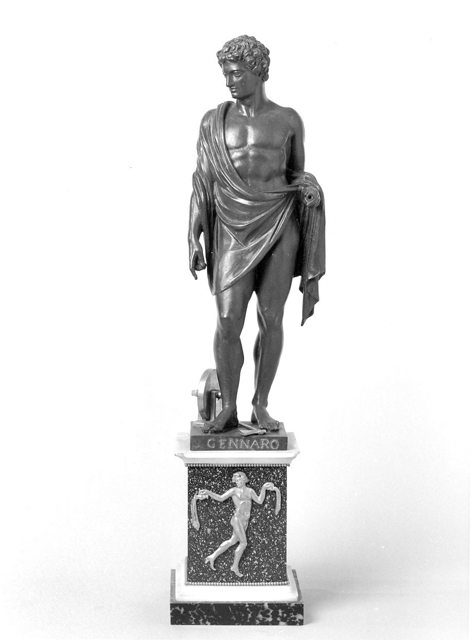 Figura maschile in bronzo con mantello, capo volto a destra, regge sull'avambraccio sinistro un capo del mantello e nella mano sinistra un oggetto (mancante) di cui si vede il supporto. Tra i piedi un ascia e a destra una mola per affilare, in bronzo dorato. Il basamento bronzeo con la scritta "Gennaro", poggia su un parallelepipedo in marmo bianco, verde e granito rosso con sulla facciata il simbolo del segno zodiacale dell'acquario: un uomo nudo che versa acqua da due brocche