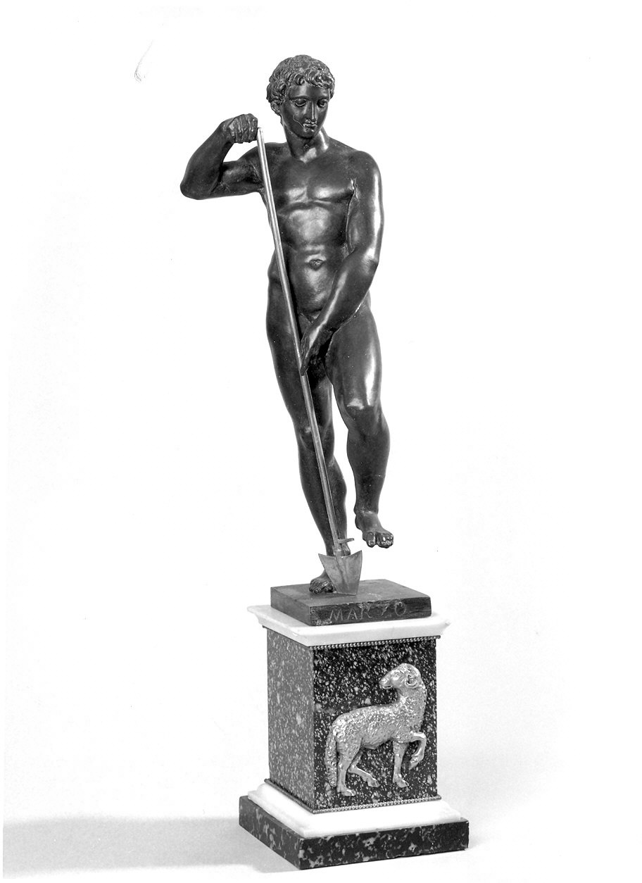 Figura maschile in bronzo, nuda, regge con la mano destra una zappa, in bronzo dorato, che spinge nel terreno con il piede sinistro; nel piedistallo la scritta "Marzo"