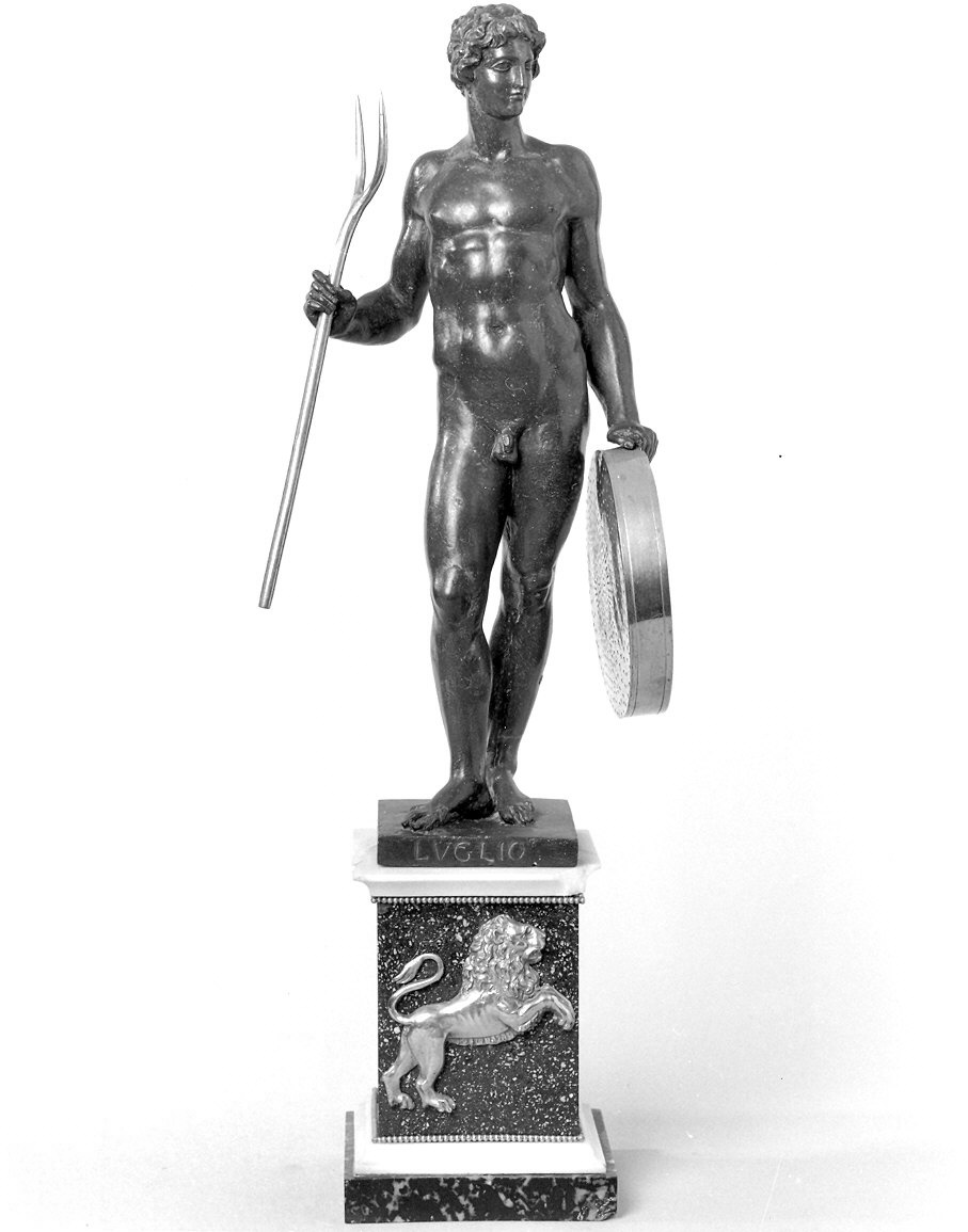 Figura maschile in bronzo, nuda, tutto il peso poggiante sulla gamba sinistra, tiene con la sinistra stesa un grande crivello in bronzo dorato e un forcone sempre in bronzo dorato; sul piedistallo in bronzo la scritta "Luglio" e il simbolo zodiacale dei leone in facciata