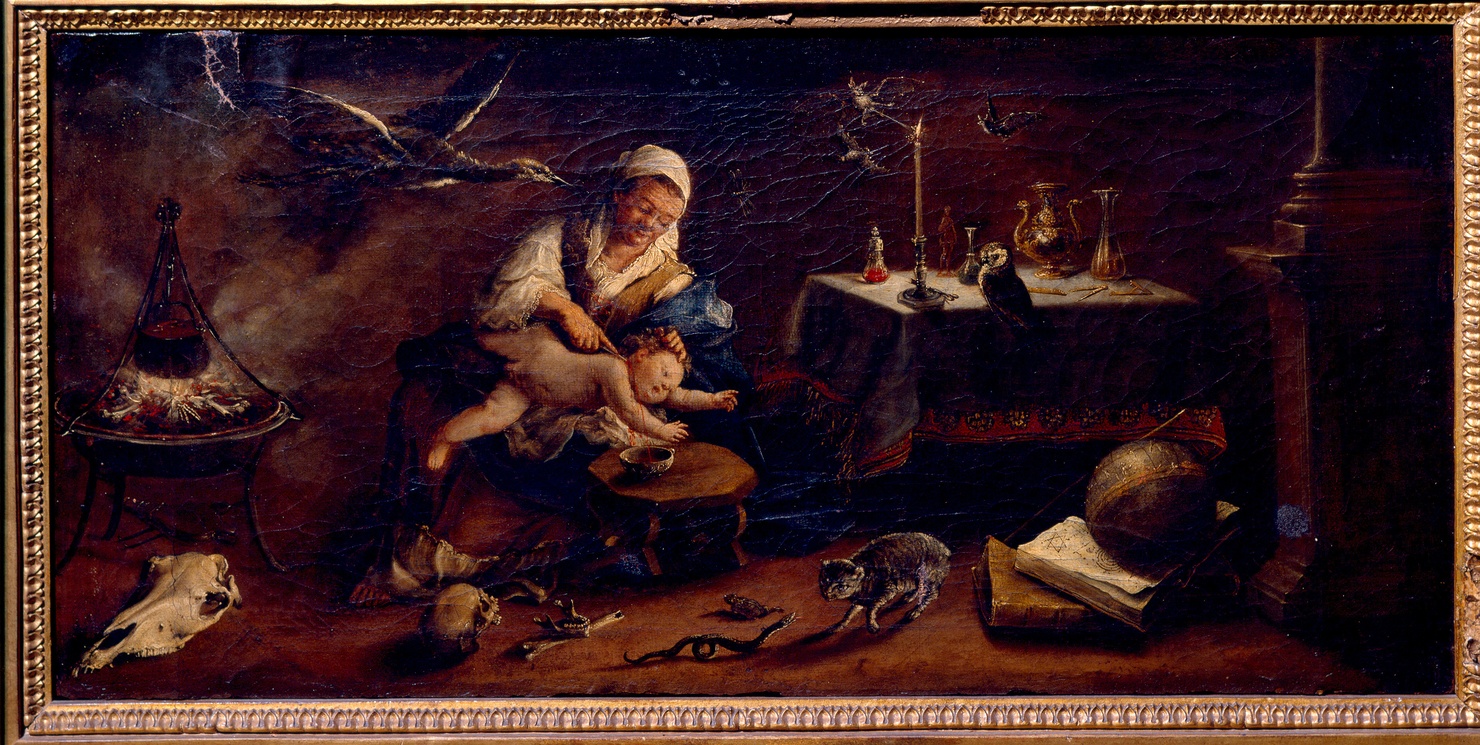 Figure: strega; bambino sgozzato. Animali: gatto; serpente; civetta; pipistrelli; rospo; uccello. Oggetti: braciere con paiolo; teschio animale; teschio umano; sgabello; ciotola; tavolo con tovaglia; candeliere con candela accesa; statuetta; ampolle; vaso ansato; squadra con compasso. Interno. Elementi architettonici: colonna su alto basamento